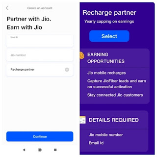 3 – अब लॉग इन हो जाने के बाद आपके सामने एक page Box ओपन होगा उसमे आप अपना क्रमश: Email id,Jio Number एड करें तथा उसके बाद Recharge Partner को Select करके Continue पर Click कर दें । जैसे निचे Screenshot में दिखाया गया है ।